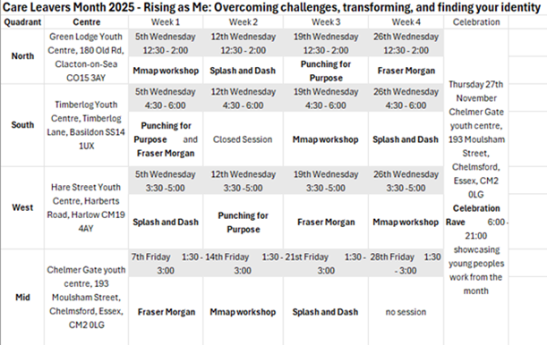 Throughout the month, the Involvement Team at Essex County Council will be hosting bespoke sessions at drop-ins across the county, designed to connect, empower, and celebrate care leavers. These sessions are built around the key themes of this year’s Care Leavers Month: